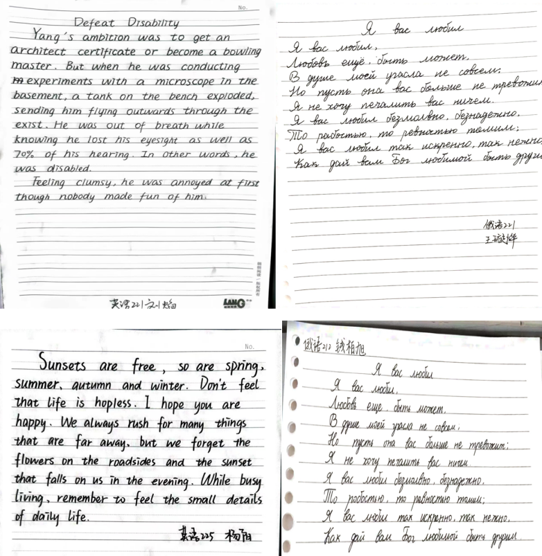 为提升同学们外文书写兴趣,养成良好的书写习惯,展现文字的审美价值,2024年4月21日15vip太阳城集团官网举办了“英语、俄语书写大赛”活动。