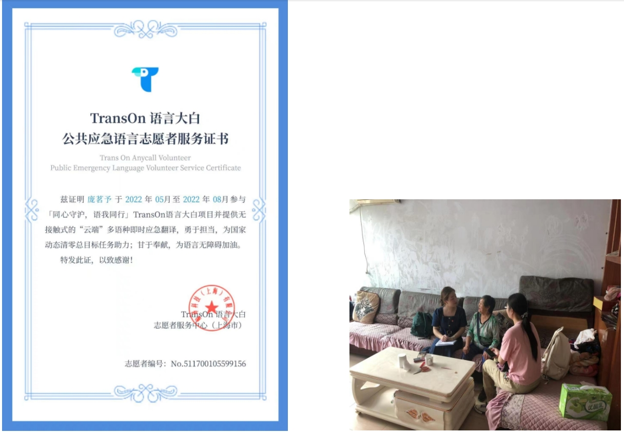 大学是个多元化的舞台,庞茗予汲取多方优势,争做德智体美劳全面发展的合格太阳城学子。2022年5月至8月,她参与“同心守护,语我同行”Trans On语言大白活动,并提供无接触式的“云端”多语种即时应急翻译,为国家动态清零总目标任务助力。2022年8月,她以负责人身份组织开展以“关于红色文化调查与思考”为主题的暑期“三下乡”活动,为红色文化的宣传贡献了自己的一份力量。并且于2022年8月荣幸参演了大庆市旅发大会的演出。