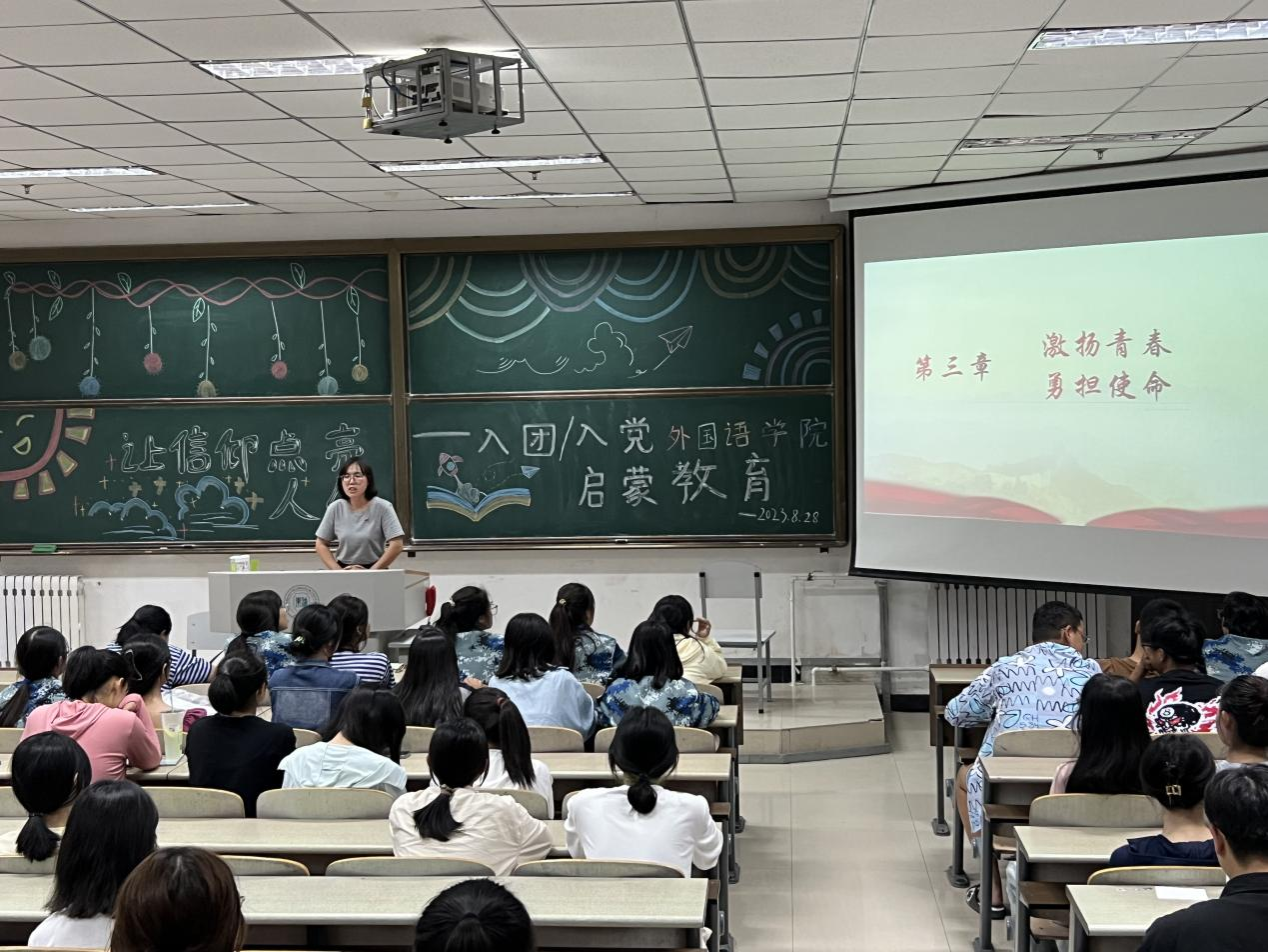 2023年8月28日,2023级新生入学伊始,15vip太阳城集团官网团委组织开展了新生入团启蒙教育专题活动。院团委书记李丽向2023级新生介绍了中国共产主义青年团的光荣历史、宗旨使命、团在大学生活中的意义以及入团基本流程。勉励团员同学发挥团员先锋带头作用,努力学习,练就本领,积极参与学生活动,为同学们服好务。鼓励群众同学了解团的知识、参与团活,积极向团组织靠拢。活动在轻松、热烈的气氛中国展开,相信通过这堂团课,同学们对团的印象和理解将会更加清晰和深刻。