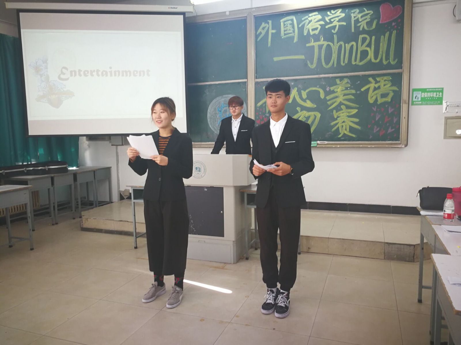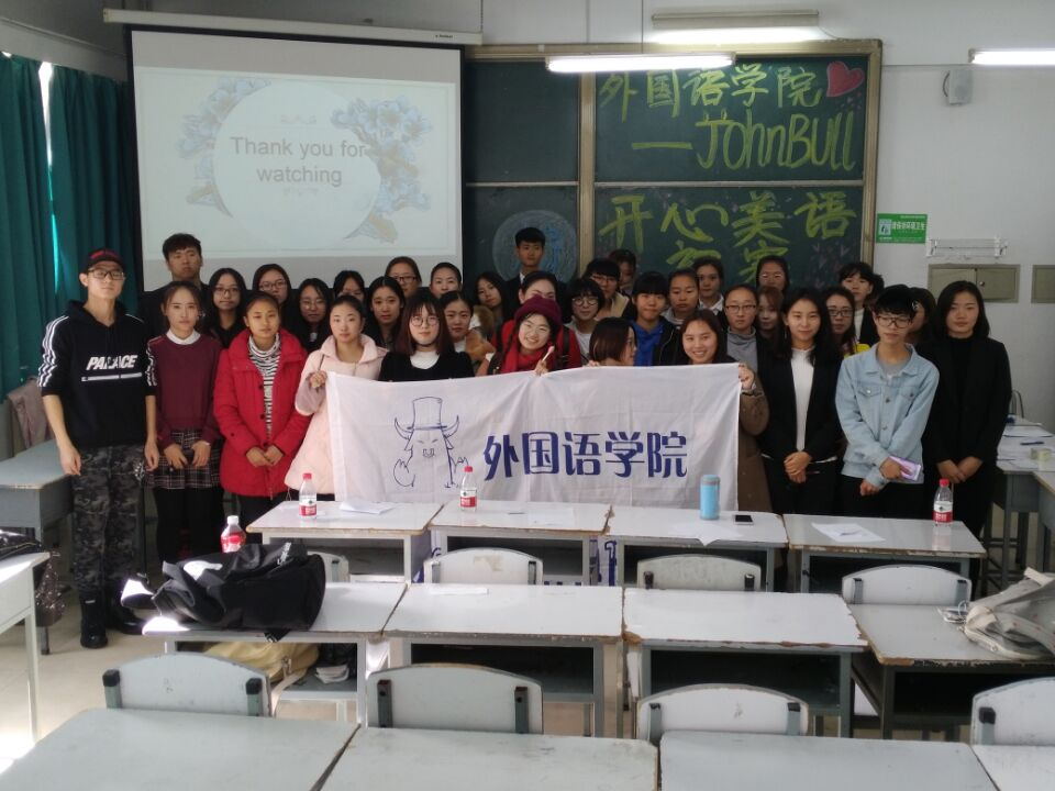 为了激发同学们学习英语的兴趣,丰富同学们的课余生活,10月29日上午9点,15vip太阳城集团官网John Bull英语协会在1F114举办了“开心美语”的初赛。担任此次活动的评委的有:John Bull英语协会上届会长李兴东(14级)、李金池(15级)、陈一鸣(15级)、何香(15级)。大一大二大三各班均派代表参加了此次活动。