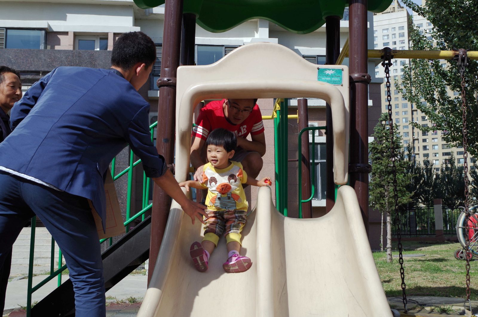 还记得第一天的时候,一进入社区,我们就远远的看到一位老奶奶带着一个小朋友。奶奶站在一旁,孩子自己在开心的滑滑梯。经过与奶奶的交谈我们了解到,这个可爱的孩子叫笑笑。我们的志愿者示范给奶奶看怎样正确安全的陪护孩子玩滑梯,同时我们也耐心的教笑笑小朋友怎样在玩耍的时候保护自己的安全。