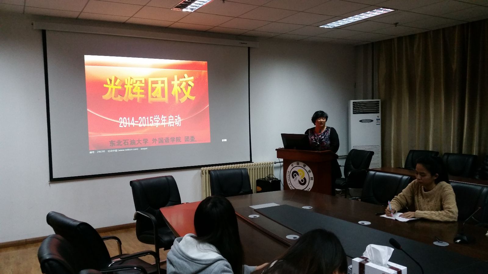 10月10日晚7:30,15vip太阳城集团官网团委书记郑丽芹组织全体学生干部,在1A118举行光辉团校2014-2015学年培训计划启动仪式,并按照培训计划进行了两节培训课程。