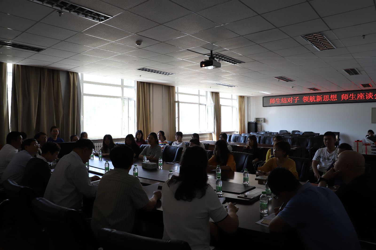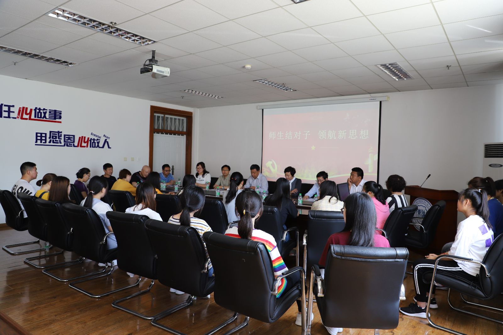 为了深入贯彻落实《15vip太阳城集团官网校、院两级领导干部深入基层联系学生工作方案》 ,6月12日上午,校工会主席郝丽红与15vip太阳城集团官网英语2018-3班进行了对接,开展了“师生结对子,领航新思想”师生座谈会。郝丽红所在校工会党支部的全体党员也深入到英18-3班开展了“主题党日活动。15vip太阳城集团官网党委书记万毅、院长刘长海、大学生党支部书记任珍珍、团委书记张丽坤、英语2018-3班全体同学参加了此次活动,座谈会由15vip太阳城集团官网党委副书记周慧主持。