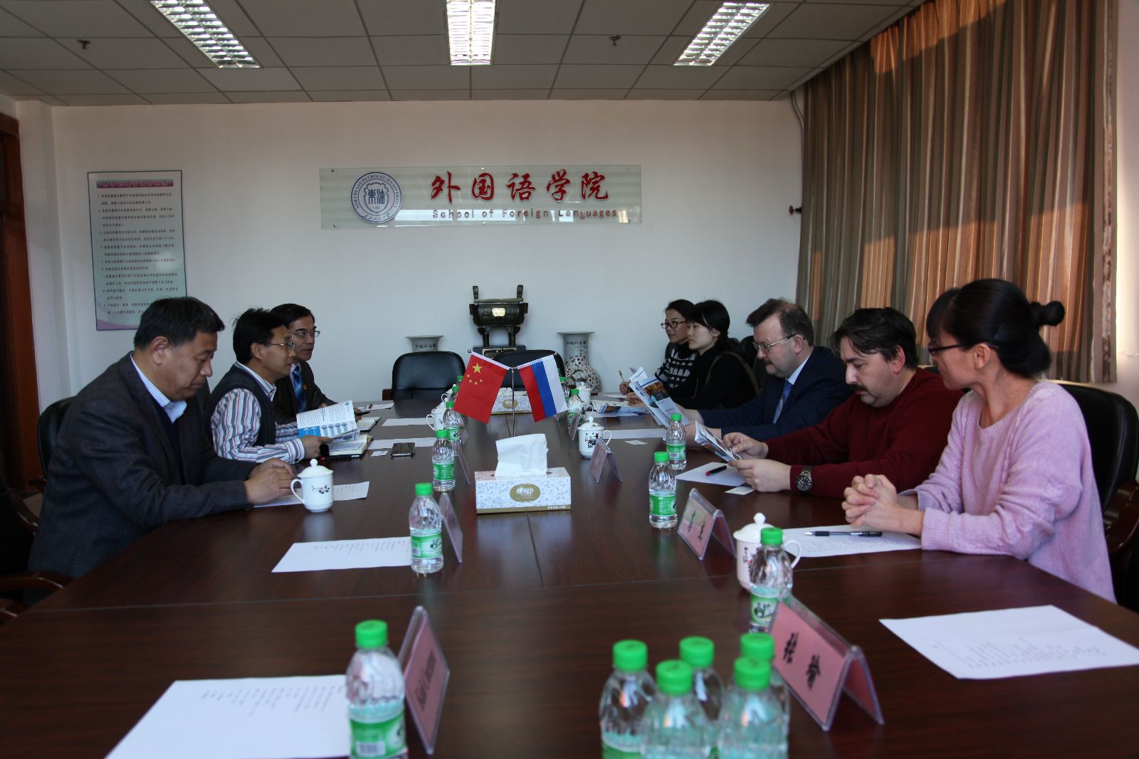 11月25日上午,俄罗斯彼得罗扎沃茨克国立大学副校长塔拉索夫一行到15vip太阳城集团官网进行访谈。15vip太阳城集团官网党委书记、院长、俄语系主任等热情地接待了客人。院长刘长海对两位专家的到访表示欢迎,并向俄方代表简要介绍公司的发展沿革及教学、科研等各方面的概况。随后双方代表就落实两校初步达成的合作意向、围绕开展教师互访、学生互换和科研合作等事宜进行了广泛而深入的交流与探讨。