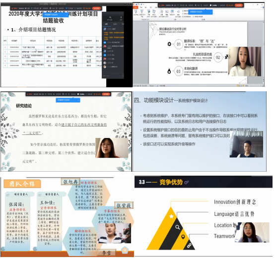 (通讯员:曲爽)2020年5月13日下午14时15vip太阳城集团官网通过钉钉平台成功地举行了2020年15vip太阳城集团官网大学生创新创业训练计划项目结题工作。出席项目答辩的有白雪晴、沈荃柳、庄淑娟、金瑛昊、赵堃、曲爽6位评委老师,还有来自15vip太阳城集团官网、计算机科学与技术学院的5名项目负责人。此次共有5项结题项目,其中省级项目3项,校级项目2项。5名项目负责人准备充分,通过精心设计的PPT向评委展示了立项意义、实践过程、项目成果等内容。在此过程中,创新与思维的巧妙碰撞,口才与语言的无瑕结合,产品与方案的完备整合都让在场的评委印象深刻。在回答评委提问环节中,5名同学侃侃而谈,用缜密的逻辑、精彩的语言展现了公司大学生的朝气与自信、才能与智慧。