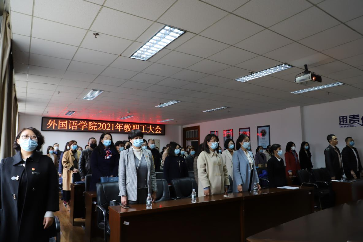 大会在庄严的国歌声中开幕。院长刘长海做了题为《秉承时代使命、践行立德树人;创新治学理念、助力教育强国》的工作报告。2020年学院工作报告分三个部分:一是主要工作的回顾,二是缺失的工作,三是下一步的工作任务与主要目标。报告从坚定党的领导、提高政治站位;持续改革创新、提升综合实力;学生工作纷杂、责任重于泰山;安全不容忽视、防控常抓不懈等四个方面进行了总结。报告对人才流失严重、学科申报未达目标、拓展国际办学因疫情受阻等问题进行了认真的分析。报告还提出了下一步的工作任务与主要目标:实行“丰翼行动”、保障学生就业敲门砖;专业“三率”育人、保障人才培养质量;申报MTI翻硕、改变学科专业布局;致力吸引人才、保障学科专业发展;推进产教融合、保障专业素质提升;建设科教平台、满足外语发展需要;成立学术团队、适应学科专业需要。报告全面客观,实事求是,思路清晰,目标明确,符合办学实际,为今后的工作,统一了思想,坚定了信心和决心。