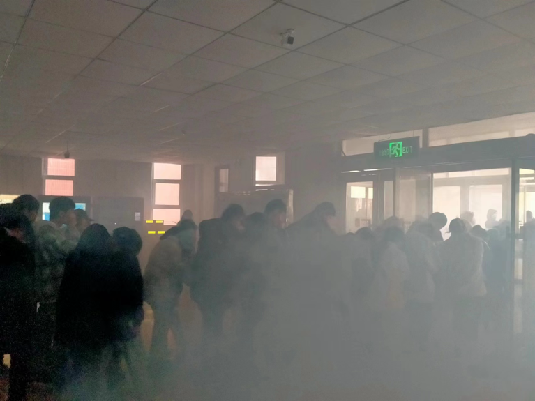 活动第二项,火场疏散逃生演练。与会同学在老师的指挥下有序撤离演练场地。同学们听指挥,行动迅速,用湿毛巾捂住口鼻,降低身体重心,沿楼梯一侧有序撤离虚拟火场。