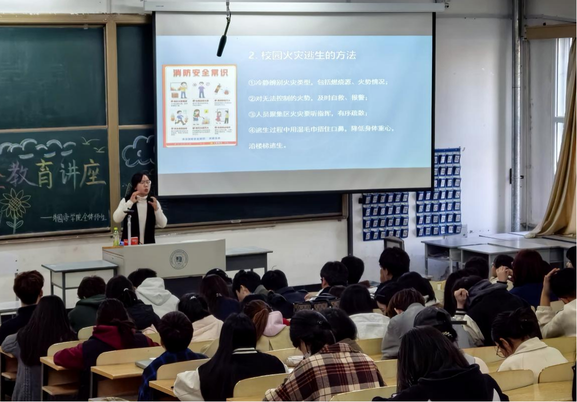 活动第一项,学院团委书记,2020、2022级辅导员李丽老师结合公司学生工作和教学工作实际,从常见的校园消防安全隐患、校园火灾逃生技巧和校园火灾预防建议三方面,与参会师生进行了交流分享。