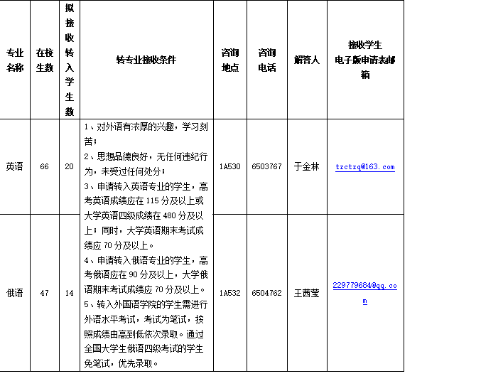 (4)申请转入俄语专业的学生,高考俄语应在90分及以上,大学俄语期末考试成绩应70分以上。