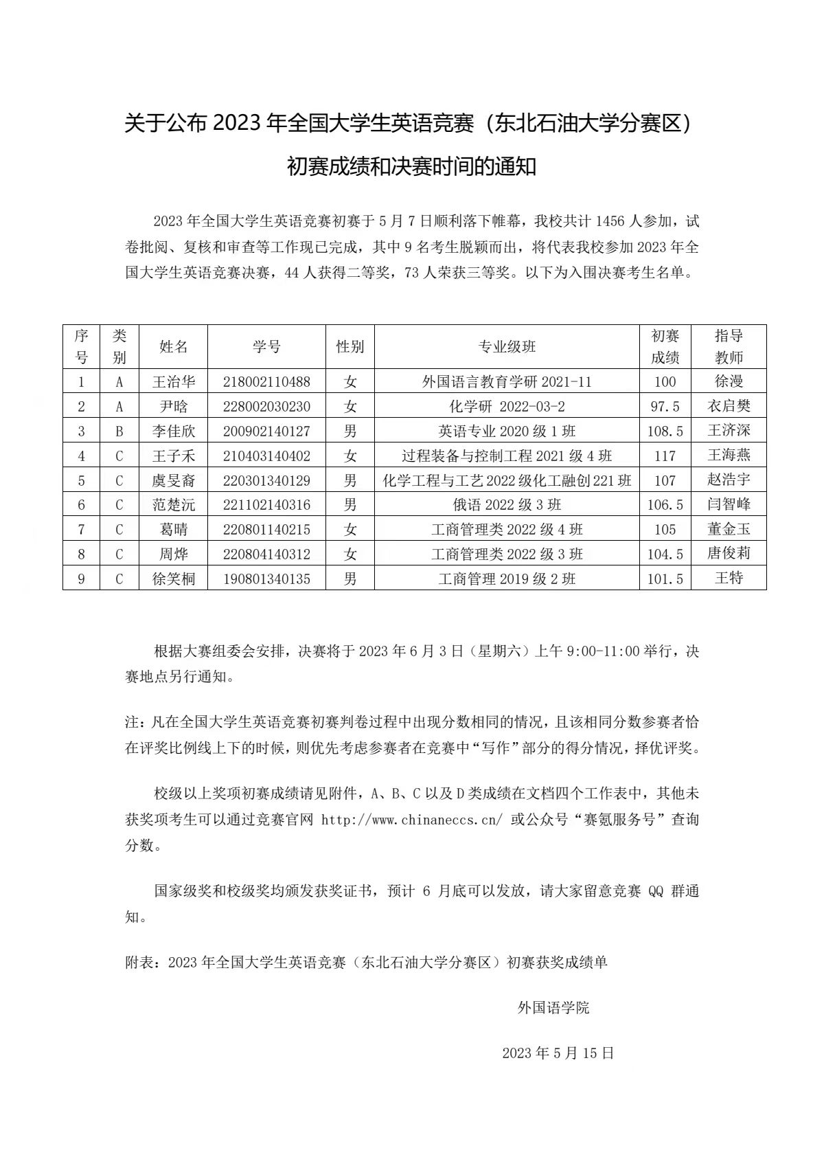 关于公布2023年全国大学生英语竞赛(15vip太阳城集团官网分赛区)初赛成绩和决赛时间的通知