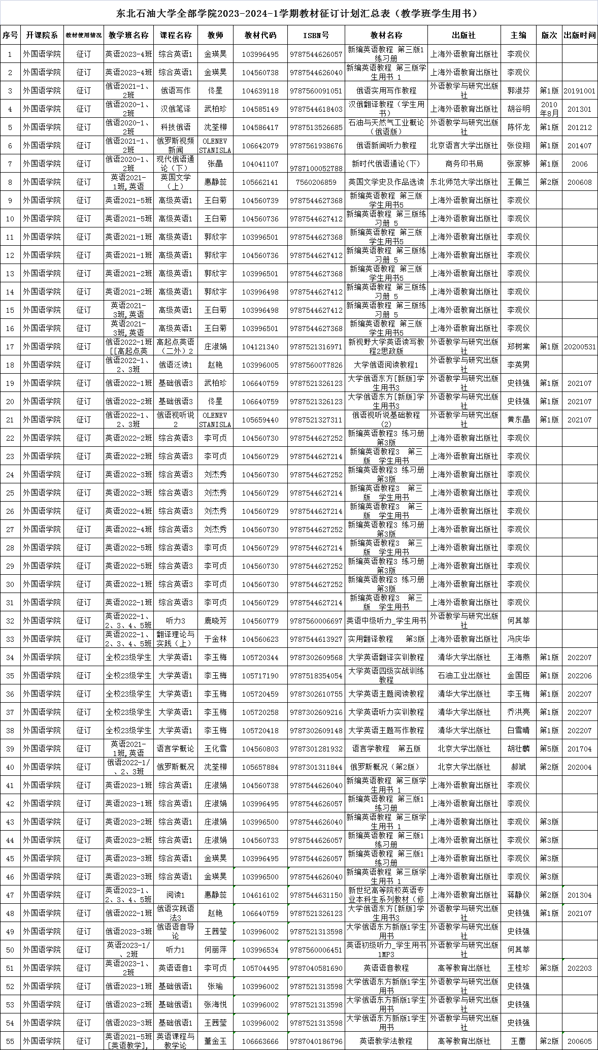 15vip太阳城集团官网全部学院2023-2024-1学期教材征订计划汇总表(教学班学生用书)