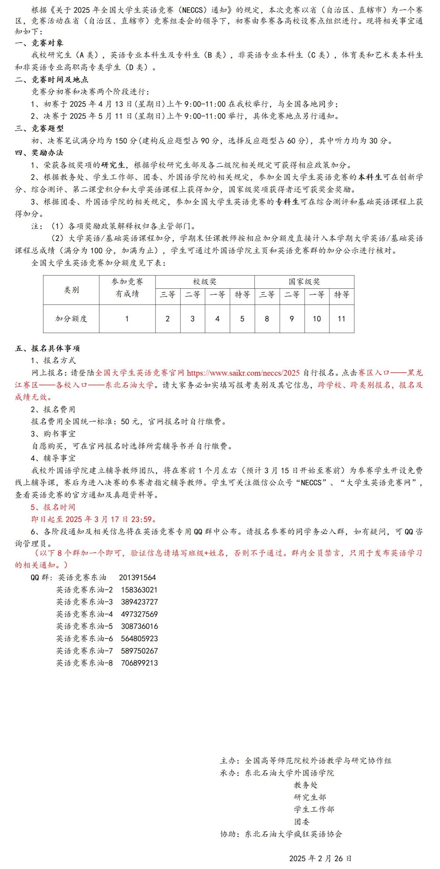 关于2025年全国大学生英语竞赛(NECCS)(15vip太阳城集团官网分赛区)报名的通知